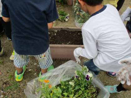 6月8日,2年生は花壇とプランターの植え替えをしました。パンジーを抜いて,次に植えるマリーゴールドの準備をしました。この前植えたマリーゴールドの種から日に日に育って,もう少しで植え替えられるまで生長しました。植える時が楽しみです。