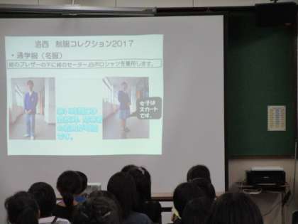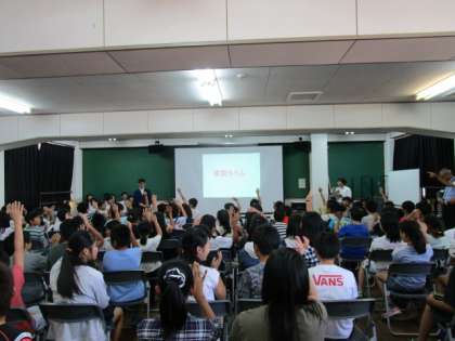 9月8日(金),洛西中学のオープンスクールに参加しました。新林小学校と境谷小学校の子どもたちが一緒になって体験しました。始めは会議室での全体会でした。制服の紹介やきまりについて,各教科や部活動についてなどの話を生徒会本部の生徒から聞きました。