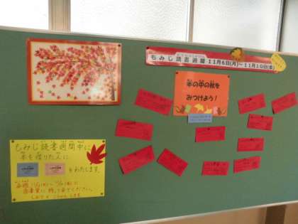 図書委員会では,もみじ読書週間中に,図書室から本を借りた人に手作りのしおりをプレゼントをするという企画もしています。
