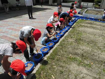 生活の学習「おおきくなあれ わたしのはな」で,あさがおの種をまきました。自分の植木鉢に土を入れて,指で穴を開け種を入れました。もとひをかけて,最後に水やりをしました。これから毎朝水やりを頑張って,きれいな花を咲かせてほしいと思います。