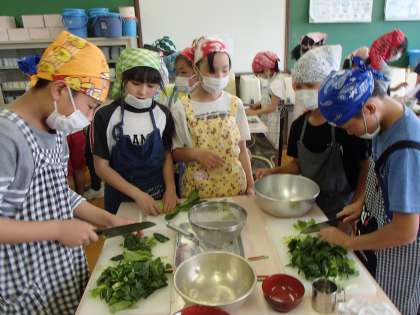 小松菜の炒め具合いに気をつけたり,卵の味付けに気をつけたりして,協力して調理実習を進められました。