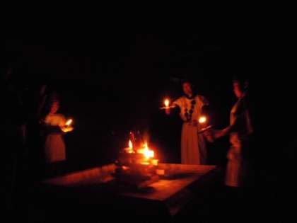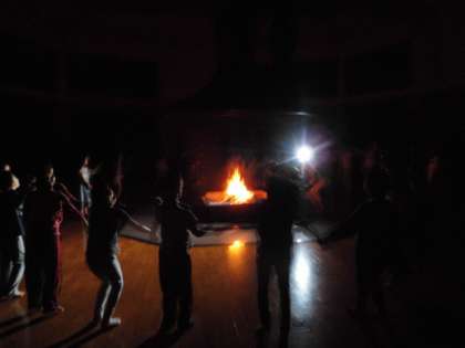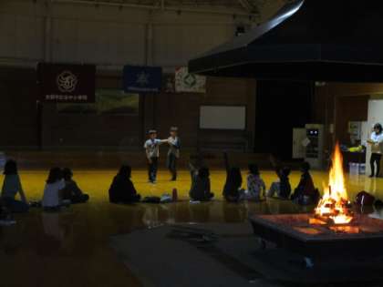 雨天のため,ホールの中でのキャンプファイヤーでした。レクレーション係が中心になって進行してくれました。火の神から火の子へ火を分け与えて,点火しました。その後は歌やゲームを楽しみました。 今日の活動はこれで終了です。明日は磯観察や野外炊事などを予定しています。お天気が回復することを願っています。ホームページの更新も今日はこれで終わりです。また,明日もお楽しみに。