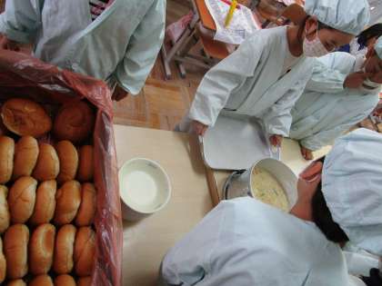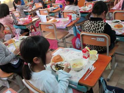 給食当番も板についてきました。待つ子たちも姿勢よく座っています。今日の献立はクリームシチュー,ひじきのソテー,パン,牛乳です。おいしくいただいています。