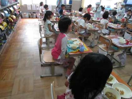 給食当番さんがおかずを配ってくれる間,静かに待つことができています。姿勢もいいですね。