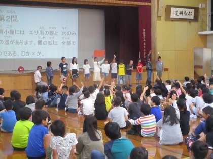 校長より運動会の振り返りの話や,賞状渡しなどを行ってから,5,6年生から委員会活動の報告がありました。放送委員会と飼育委員会でした。クイズ形式で楽しく活動の様子を伝えました。