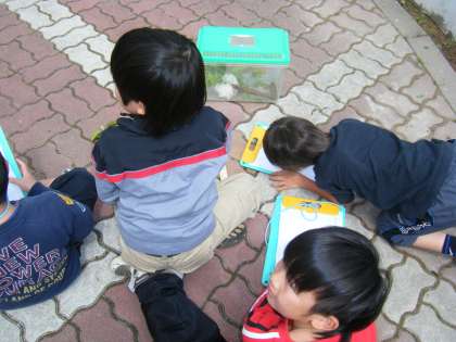 国語「観察名人になろう」で学習した,名人の技をぜひとも自分のものにしようと,今日は校内の生き物や植物などいろいろなものを,観察しました。形は?色は?大きさはにおいは?と,できるだけたくさん見つけようとがんばる2年生でした。