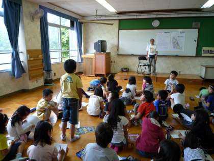 総合の学習で地域にお住まいの平井さんに「らく西ニュータウンのひみつ」についてお話を聞きました。