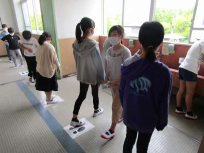 手洗い場での3密が予想されますので,足型を貼って距離を保つようにしました。みんな約束を守って並んで待っていました。水道も一つおきに使うようにして飛沫を防いでいます。