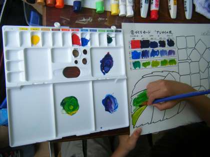 2年生になり,はじめて絵の具セットを使い始めて,今日で3回目となりました。少しずつ準備や片付けの仕方,筆の使い方などにも慣れてきました。今日は色を混ぜながら,あじさいの色をつけていきました。ちょっとずつていねいに色をぬる2年生の子どもたちでした。