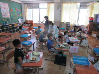 初めての給食を食べました。感染防止のため,給食当番はできませんが,静かに座って配膳されるのを待っていました。