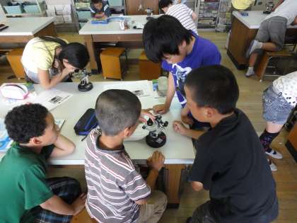 まずは,肉眼でたまごを見つけ,それを顕微鏡をとおしてさらにくわしく観察してみました。たまごが産まれてから一週間が過ぎているものもあり,たまごの中でメダカが大きくなっている様子や目がしっかりとできていることも観察できました。たまごの中でメダカが動いているところを観察できた人もいました。今度は,たまごからかえったメダカの赤ちゃんを観察し,大きくなるまで大切に育てていきたいと思います。