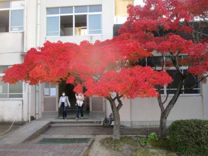 真っ赤に染まったもみじの葉をくぐりぬけて下校していきます。この時期だけの風景です。
