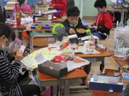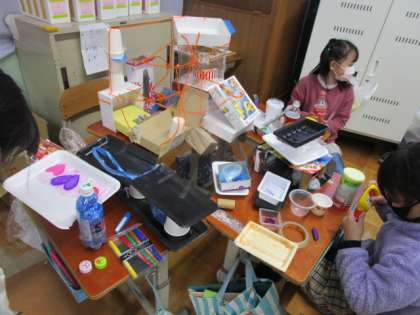 廃材を使って,おうちを作りました。小さい友だちが住めるおうちを想像して,どんなことができるか考えながら作りました。できあがったら,お互いの作品を鑑賞します。