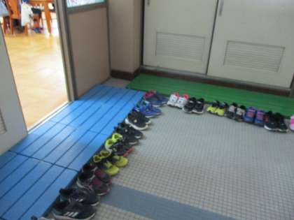 始業式前の集合時に,左右の靴がきっちりそろえている姿。