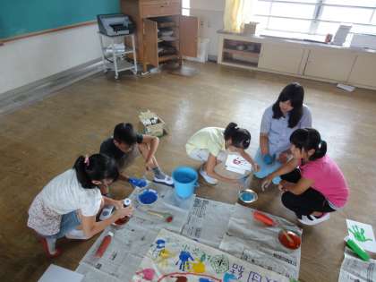 学年目標である「わ」を基盤とし,5年生45人が一人一人手形をおしていきました。