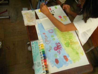 絵の具の使い方を6月に学習してから,3ヶ月。ずいぶんと絵の具を上手にぬれるようになってきました。今日はお話の絵の下書きに色をつけていきました。細かいところは,ていねいに注意をはらいながら,がんばっていました。