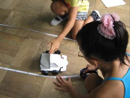 強い風の時には勢いよく進み,弱い風の時はゆっくりと進む様子を調べました。算数の授業で学んだまきじゃくを使って,進んだ距離を測って比べます。