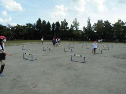 6年生の体育では,ハードル走の学習をしています。リズムよくハードルを跳ぶための,ハードルとハードルの間隔(インターバル)を探すことを頑張っていました。最後には,現在のタイムを計測しました。この記録からどこまでタイムを伸ばせるか,楽しみです。