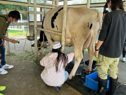 バター作りの次は、乳しぼり体験です。帽子をかぶって、大きな牛さんの前までやってきました。