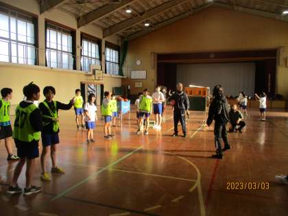 ※部活動バスケット部の様子です。いかがでしょうか。みんな汗をかいてバスケットを楽しんでいます。6年生と先生たちとの対決。勝敗よりも先生たちと試合ができる喜びに満ち溢れていましたという意味。