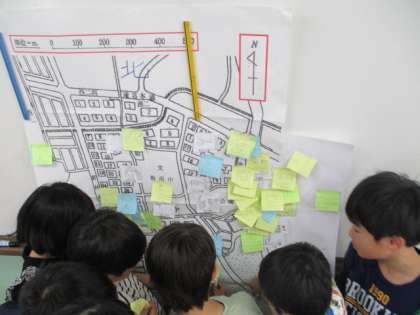 以前の校区探検で見つけた施設や土地の様子を校区地図にまとめました。「西側には田んぼがいっぱいあった」「郵便局も見つけたよ」と、探検前よりもさらにたくさん境谷の様子を知れたようです。少し校区地図が雑然としてきたので…地図記号について学習し、地図記号入りの校区地図作りにも挑戦していきます。