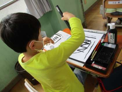 本日初めての書写「毛筆」を行いました。絵の具の筆とはまた違う筆にわくわくした表情の子どもたち。準備の仕方、道具の置き方や持ち方を学んだあと、墨汁をつけて半紙に書いてみました。次の毛筆の時間も楽しみな様子でした。
