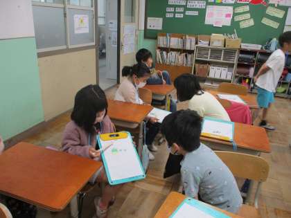 生活科「ぐんぐんそだて」の学習では、育てているトマトの実の観察をしました。同じ実の中でも、上と下で色が違うことや触ってみると、思ったよりもかたいことに気づいていました。どんどん大きくなる実を、毎日嬉しそうにお世話しています。