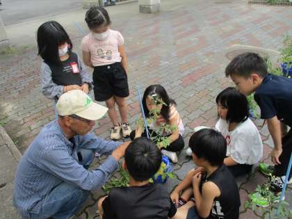 今日は、野菜育ての名人に来ていただき、お世話の仕方を教えていだたきました。まず、トマトがぐんぐん大きく育つために、わき芽を切りました。「これは、切っていい芽かな?」と、トマトをじっくり観察しながら、手入れをしていました。