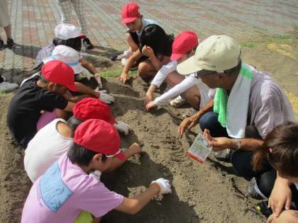 生活科「ぐんぐんそだて」の学習では、冬に収穫するダイコンとカブの種をまきました。今回も、地域の野菜の先生に、来ていただきました。ダイコンは20cm間隔で、カブは線のところにパラパラまく、ということを教えていただきました。1週間くらいで、芽が出るそうです。どんな芽がでるのか、今から楽しみです。