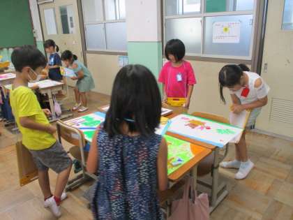 低学年ファミリー合同での、図画工作科「お話の絵」の学習もいよいよ最終回でした。できあがった作品のよいところ見つけ、鑑賞会をしました。