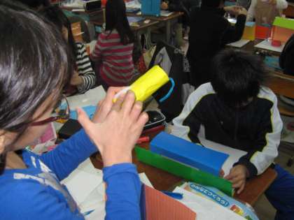 いろいろ持ち寄った材料を基に,試行錯誤を繰り返しています。時々お互いの作品をみあう時間を設け,友達のよいところを見つけたり参考にしたいところを見つけたりして,自分の作品に生かしています。