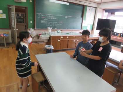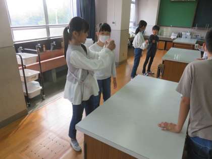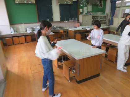 5年生は理科の「流れる水のはたらきと土地の変化」の学習で、川の上流と下流で石の形がちがうのはなぜかということを考えました。「上流から流されて、下流にくるまでに石とぶつかり合って丸くなったんじゃないかな。」という仮説を基に、スポンジを使ってモデル実験を行いました。