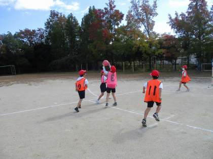 体育科の学習では、「パスゲーム」をしています。4時間目、5時間目と回数を重ねるごとに、チームで協力し合いながら、たくさん得点を入れられるようになってきました。試合と試合の間には、作戦会議を開き、「パスパス作戦」や「すばやくつなぐ作戦」など、作戦を考えながら、がんばっています。