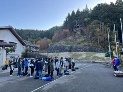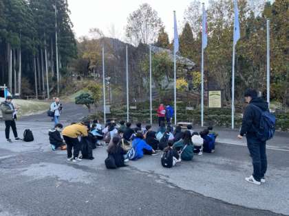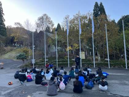 7時半からの朝の集いは、5分前行動が守れていたこともあり、早めにスタートしました。玄関前に揃った子どもたちは、出発時に話したようにしっかり座って活動をしています。