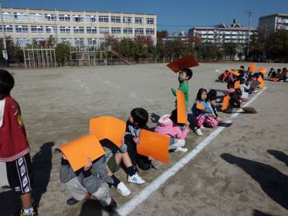 19日(月),航空写真の撮影があり,全校児童がそれぞれの色の紙を持って,ほっこり亭の人文字を作りました。
