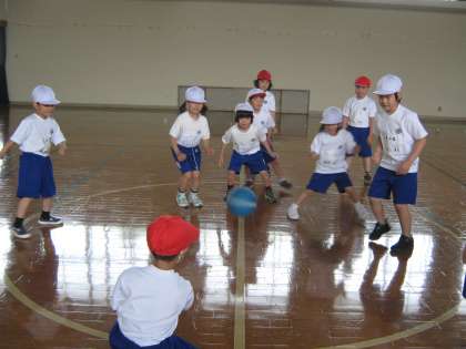 体育では,ころがしドッジボールをしています。