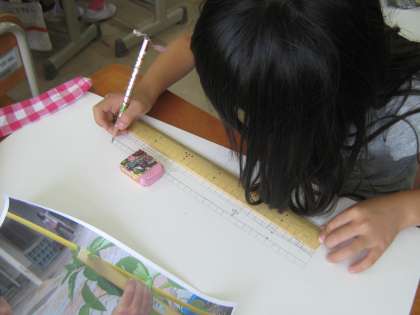 算数の勉強で使っている30cmものさしを使って,なえの長さをはかっている自分を描いていきます。