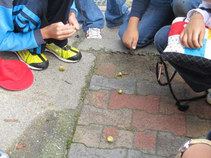 その後は,各自,山での朝を楽しみました。中には,落ちていた木の実でコマを作って遊んでいる子もいました。