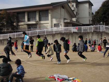短縄競技で6年生は前あやとび(1分間・最高記録),二重跳び(1分間・加算記録)に挑戦し,なかよし班では3分間で大波小波にも挑戦しました。