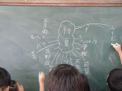 国語の学習で「春から夏へ」という俳句作りの単元を勉強しています。春から夏へ季節が移り変わる今。初夏を感じる言葉やもの,色や動物,植物などみんなで言葉集めをしました。これらの言葉を使って,どんな俳句ができるかな?