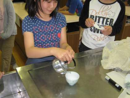 家庭科の授業で,調理器具の使い方や簡単な調理の仕方を学習しました。お湯のわかし方やお茶の入れ方を学び,各班で協力しておいしいお茶を入れることができました!来週は前庭でとれた甘夏を使ってマーマレード作りをします。みんなとても楽しみにしています!!