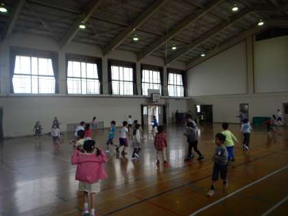 本番当日,1年生の入場のお手伝いをする6年生。今回はペアを決めて,入場の練習を行いました。また,残りの時間を使って一緒に楽しくおにごっこをしたり貨物列車をしたりして,交流を深めました。