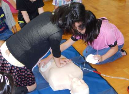 お話を聞いた後は,実際に心肺蘇生法を行ったり,AEDを使ったりしながら,対処の仕方を学びました。