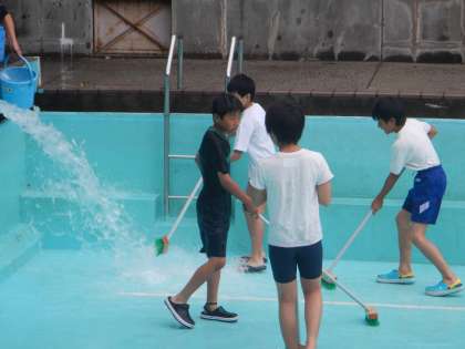 小学校生活最後の水泳学習に向けて,プール清掃を行いました。