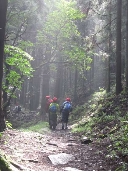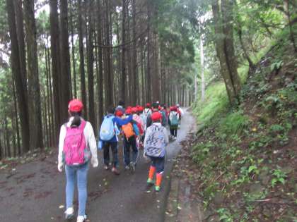 山の家でのミッション(4)は天狗杉登山。山の清々しい空気,清らかな水の音を感じながら,力を合わせて山道を進みました。