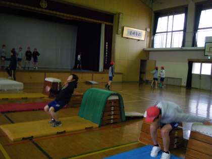 体育の学習で,跳び箱運動をしました。ねらい1では,今できる技で段数を変えて挑戦し,ねらい2では,少しがんばれそうな技に挑戦しました。場の設定を工夫することで,難しい技に挑戦しやすくなり,今までできなかった技ができるようになった人もたくさんいました。5年生のヘッドスプリング,閉脚跳び,迫力がありました!