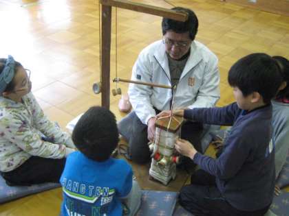 初めてくみ紐やくみ紐をくむ道具を見る子どもも多く,とても興味深々とお話を聞いていました。