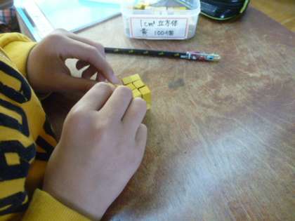 子どもたちは「1cmの立方体ってこんなに小さいのか。」などつぶやきながら調べていました。