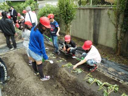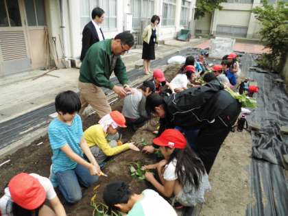 今日は,徳島県JA里浦,全農とくしま,京都青果物株式会社の方々にお越しいただき,サツマイモの歴史や育て方をご指導いただきました。