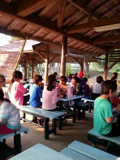 東屋で,夕ご飯です。外の景色を眺めながら,みんなで美味しくいただきました。